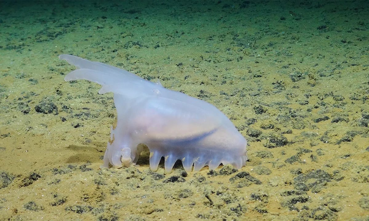 Organisms at abyssal depths are usually classified as Megafauna (organisms greater than 20 mm), including fish, sponges, anemones, urchins, clams, and sea cucumbers (holothurians), often called gummy squirrels or sea pigs. Macrofauna are smaller (from 3 to 20 mm), and include worms, amphipods, isopods, and snails. But we only know the identity of about 10% of abyssal fauna; 90% of them are undescribed. Of course there are also “charismatic megafauna” such as sharks, whales, and viper-toothed fish, but these are rare at such depths.