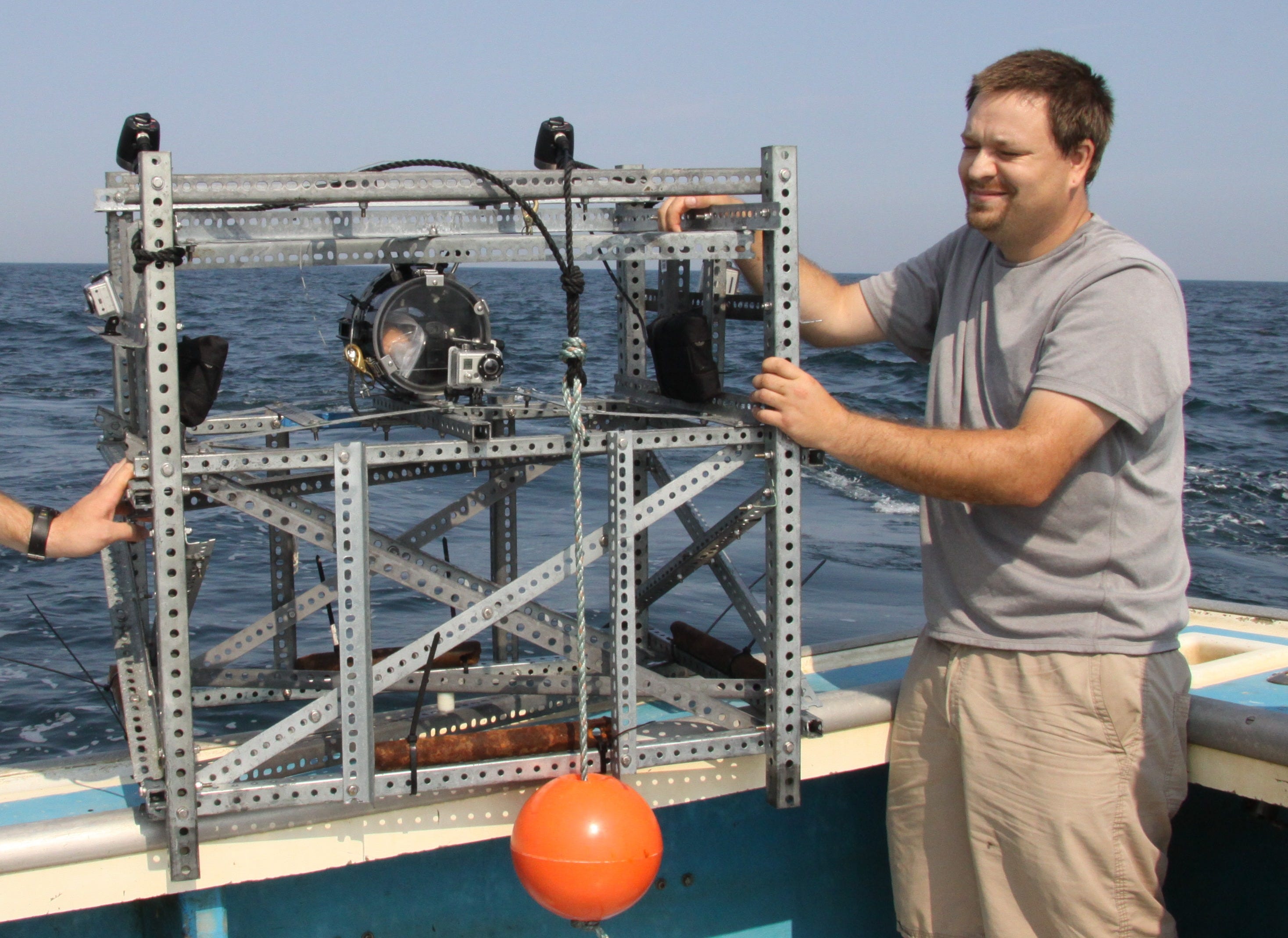 More recently, my graduate students and I were studying the behavior of black sea bass (Centropristis striata) off the coast of Maryland. We started by placing Go-Pro cameras on fish traps to observe the fish going into and out of (yes, most of them escape) the traps. But we noticed that fish usually swam into the current, so we wondered if we could build a camera platform that would do the same. This time, rather than spend my time and effort building underwater contraptions, I recruited a senior engineering student, who would work under the supervision of my PhD student, Dan Cullen. The idea was to build a solid metal base with a rotating platform on top to hold the camera facing into the current. The student had lots of ideas about bracing, spindles, bushings, rotors, and vanes, so we gave him the tools and materials and let him go to town. What he came up with looked like a miniature, two-meter-tall version of the Eiffel tower with a wind vane on top (which we dubbed the “awful tower”). Dan and I had our misgivings about it because it was narrow and rather fragile, but we took it out for a test anyway. Besides, I like to let my students make their own mistakes to see what they can learn from the experience.